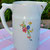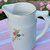 Witte lampetkan met mooi gevormd handvat. Bloemdecoratie in zachte tinten en met gouden randjes.
